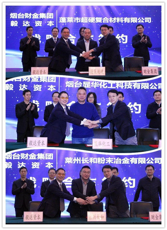 12月30日下午,新舊動能轉換毅達基金在東方海天酒店舉行投資項目集中簽約儀式,先后與煙臺顯華化工科技有限公司、萊州長和粉末冶金有限公司、蓬萊市超硬復合材料有限公司三家企業(yè)簽訂股權投資戰(zhàn)略合作協(xié)議。市發(fā)改委、財政局、金融監(jiān)管局、科技局相關領導受邀出席,與煙臺財金集團董事長劉海彬、毅達資本創(chuàng)始合伙人樊利平等投資方領導、簽約企業(yè)代表共同見證簽約。