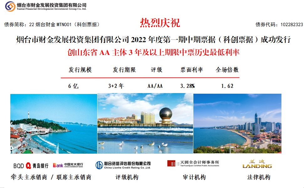 10月20日,集團(tuán)2022年度首期中期票據(jù)(科創(chuàng)票據(jù))成功發(fā)行!發(fā)行規(guī)模6億元,期限3+2年,票面利率3.28%,全場認(rèn)購倍數(shù)1.62倍,創(chuàng)山東省AA主體3年及以上期限中票歷史最低利率,同時也是山東省首筆基金類科創(chuàng)票據(jù),煙臺市首筆用途類科創(chuàng)票據(jù)。本期債券發(fā)行由青島銀行牽頭主承,光大銀行聯(lián)席主承,聯(lián)合資信、天圓全會計師事務(wù)所及蘭迪律師事務(wù)所分別提供信用評級、審計和法律服務(wù)。