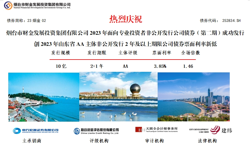 10月24日,煙臺(tái)財(cái)金集團(tuán)2023年面向?qū)I(yè)投資者非公開發(fā)行公司債券(第二期)在上交所成功發(fā)行!本期債券發(fā)行規(guī)模10億元,期限3年(2+1),票面利率3.85%,全場(chǎng)認(rèn)購(gòu)倍數(shù)1.46倍,創(chuàng)2023年山東省AA主體非公開2年及以上期限公司債券票面利率新低,也是集團(tuán)繼6月成功發(fā)行“23煙金01”公司債券后,半年內(nèi)再次刷新山東地區(qū)同級(jí)別同期限非公開發(fā)行公司債券最低利率記錄。本期債券發(fā)行由申萬宏源證券有限公司主承,聯(lián)合資信、天圓全會(huì)計(jì)師事務(wù)所及建緯律師事務(wù)所分別提供信用評(píng)級(jí)、審計(jì)和法律服務(wù)。