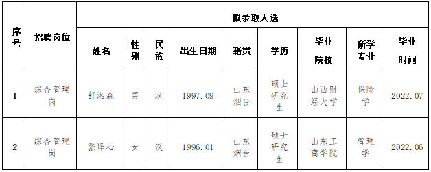 按照集團7月11日發(fā)布的招聘公告,經(jīng)簡歷投遞、資格審查、筆試、面試、集體決策等環(huán)節(jié),擬確定部分校招崗位錄取人選,現(xiàn)予以公示,公示期為5個工作日(8月1日至8月5日)。本次公開招聘崗位中綜合管理崗已招滿,此崗位招聘終止。